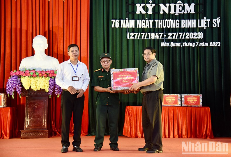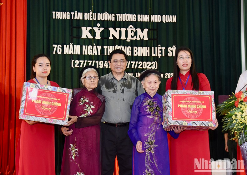 Phát biểu ý kiến, Thủ tướng bày tỏ xúc động được đến thăm Trung tâm Điều dưỡng thương binh Nho Quan; nêu rõ, Đảng, Nhà nước luôn quan tâm người có công với cách mạng; chăm lo người có công với cách mạng, thương bệnh binh, gia đình liệt sĩ là trách nhiệm, công việc thường xuyên của cả hệ thống chính trị, toàn dân chứ không chỉ trong ngày 27/7; cấp ủy, chính quyền, nhân dân cũng thường xuyên quan tâm, tri ân sâu sắc nhất đối với những người đã cống hiến xương máu cho độc lập, tự do, dân tộc.