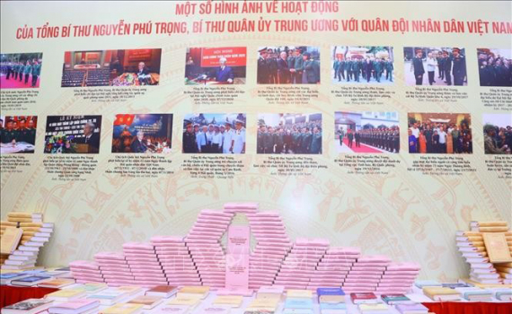 Trưng bày sách "Một số vấn đề về đường lối quân sự, chiến lược quốc phòng trong sự nghiệp xây dựng và bảo vệ Tổ quốc Việt Nam xã hội chủ nghĩa thời kỳ mới" của Tổng Bí thư Nguyễn Phú Trọng. (Ảnh: TTXVN).