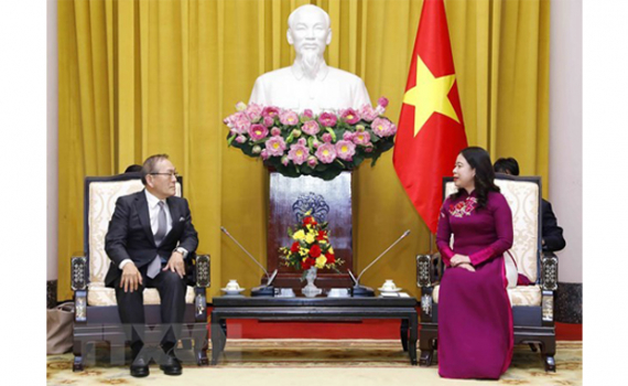 Phó Chủ tịch nước Võ Thị Ánh Xuân tiếp Chủ tịch Hãng Thông tấn Kyodo News (Nhật Bản) Toru Mizutani. (Ảnh: An Đăng/TTXVN).