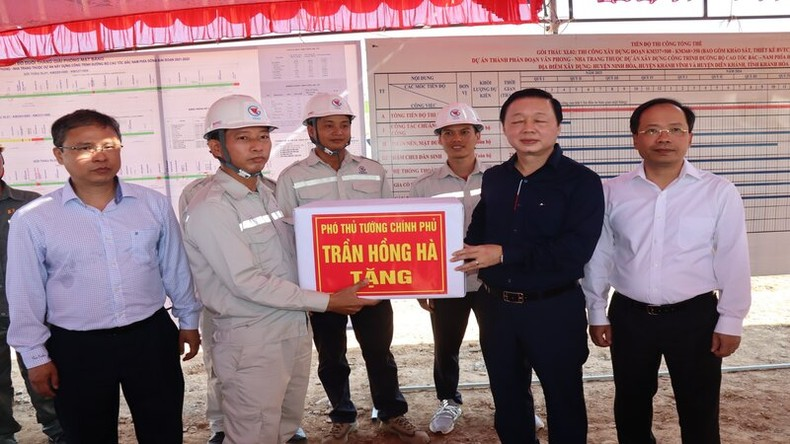 Phó Thủ tướng Trần Hồng Hà tặng quà động viên kỹ sư, công nhân đơn vị thi công. (Ảnh: VĂN KỲ).