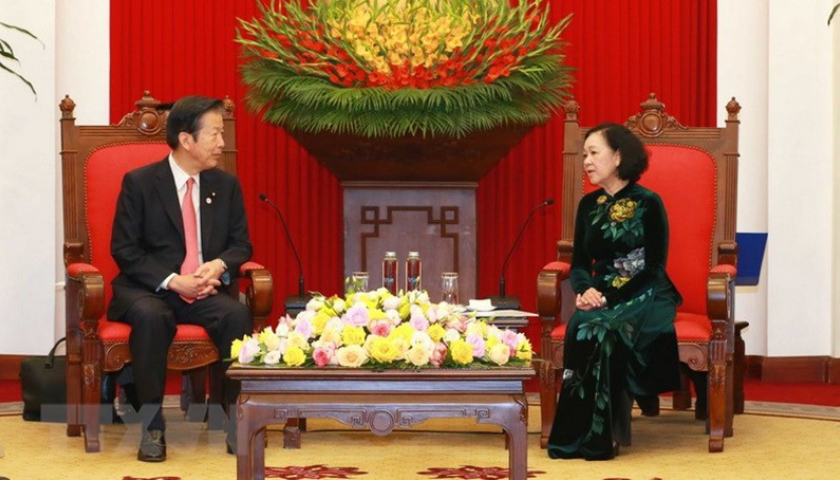 Thường trực Ban Bí thư Trương Thị Mai tiếp Chủ tịch Đảng Công minh Nhật Bản Yamaguchi Natsuo. (Ảnh: Phương Hoa/TTXVN).
