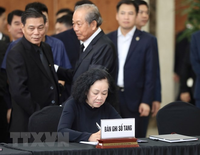 Ủy viên Bộ Chính trị, Thường trực Ban Bí thư, Trưởng Ban Tổ chức Trung ương Trương Thị Mai ghi sổ tang Phó Thủ tướng Lê Văn Thành.