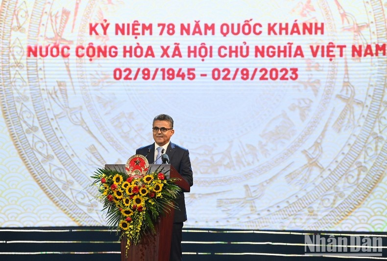 Đại sứ nêu rõ: Cách đây 78 năm, Chủ tịch Hồ Chí Minh đã đọc bản Tuyên ngôn độc lập, khai sinh ra nước Việt Nam Dân chủ cộng hòa. Những thời khắc thiêng liêng trên quảng trường Ba Đình mùa thu năm ấy mãi mãi được ghi dấu trong lịch sử hào hùng của dân tộc Việt Nam…