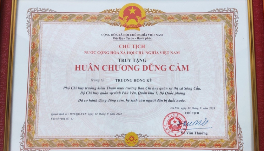 Ngày 2/9, Chủ tịch nước Võ Văn Thưởng đã ký Quyết định số 1011/QĐ-CTN truy tặng Huân chương dũng cảm cho Trung tá Trương Hồng Kỳ. Ảnh: BQP.