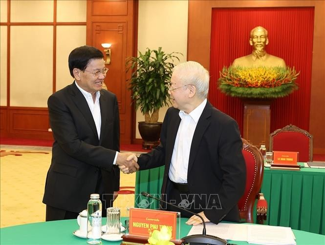 Tổng Bí thư Nguyễn Phú Trọng đón Tổng Bí thư, Chủ tịch nước Lào Thongloun Sisoulith. (Ảnh: TTXVN).