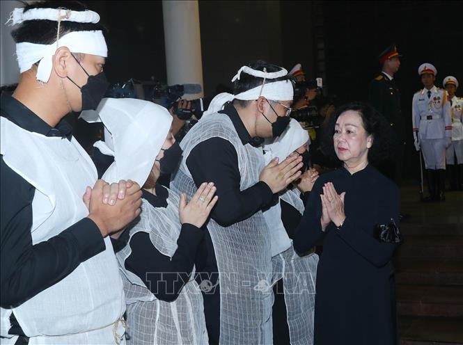 Đồng chí Trương Thị Mai, Ủy viên Bộ Chính trị, Thường trực Ban Bí thư, Trưởng Ban Tổ chức Trung ương viếng và chia buồn với gia quyến Thượng tướng Nguyễn Chí Vịnh. Ảnh: Trọng Đức/TTXVN.