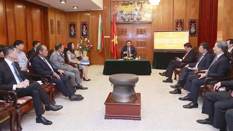 Quang cảnh buổi gặp các Đại sứ Việt Nam tại một số nước châu Âu của Chủ tịch Quốc hội Vương Đình Huệ. (Ảnh: Doãn Tấn/TTXVN).