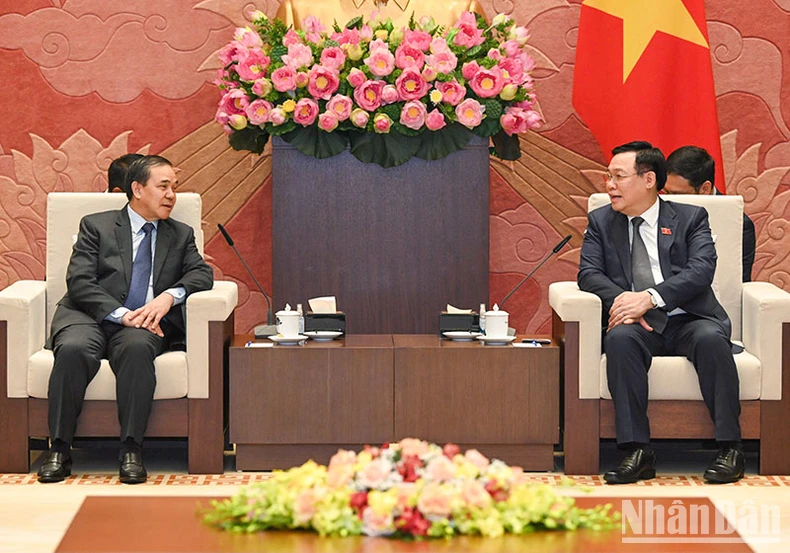 Chủ tịch Quốc hội Vương Đình Huệ và Đại sứ Lào Sengphet Houngboungnuang tại buổi tiếp.