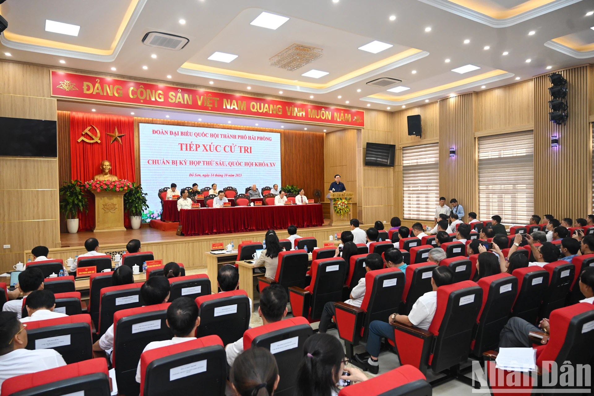 Chủ tịch Quốc hội Vương Đình Huệ, Phó Thủ tướng Chính phủ Trần Lưu Quang, Bí thư Thành ủy Hải Phòng Lê Tiến Châu cùng các đại biểu Quốc hội thành phố Hải Phòng dự hội nghị.