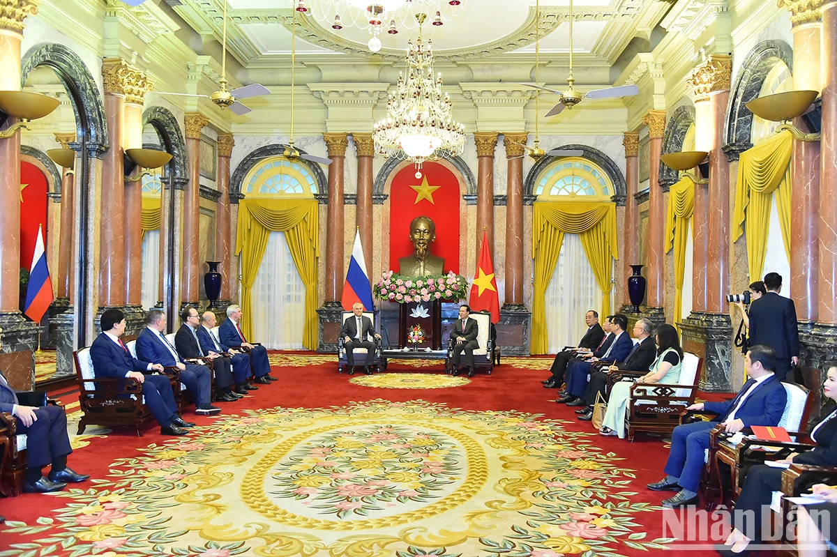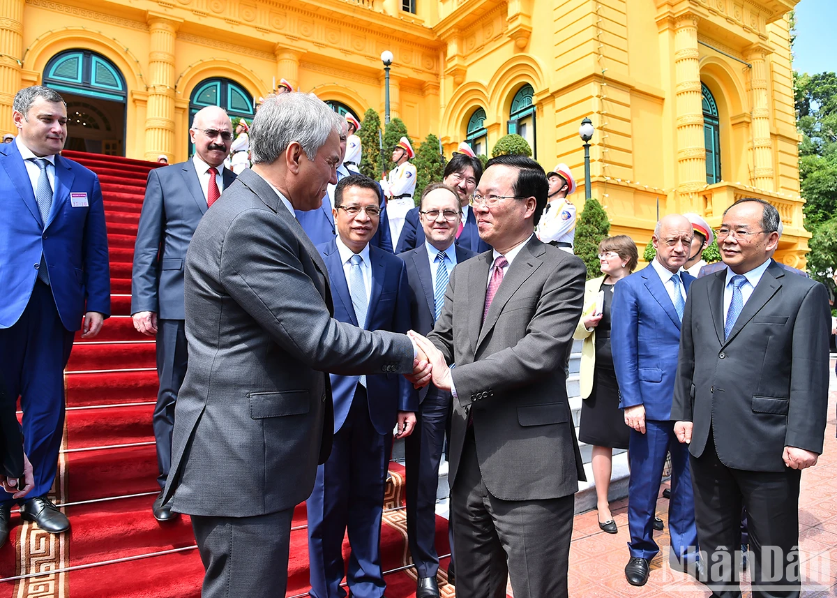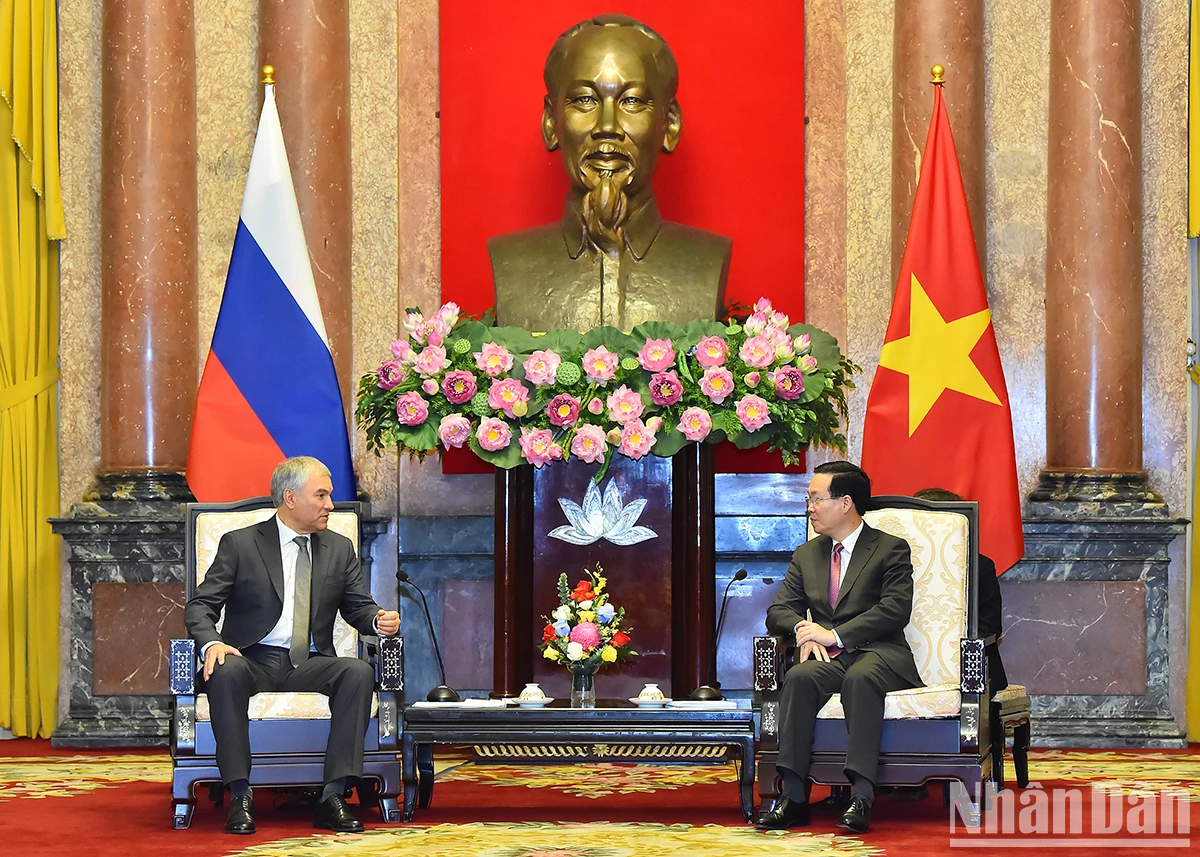 Chủ tịch nước Võ Văn Thưởng tiếp Chủ tịch Duma Quốc gia Quốc hội Liên bang Nga Vyacheslav Victorovich Volodin. Ảnh: THỦY NGUYÊN.