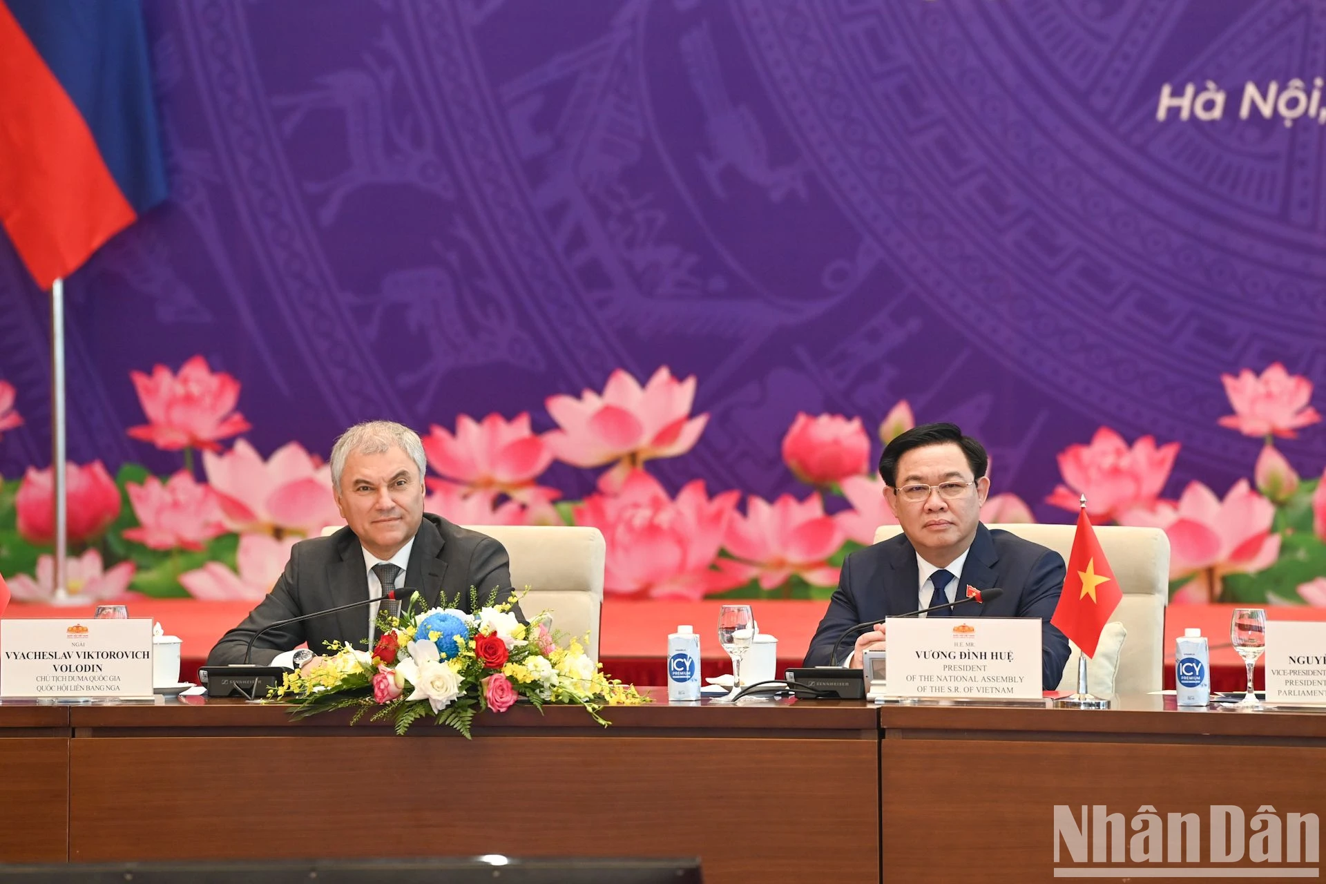 Chủ tịch Quốc hội Vương Đình Huệ và Chủ tịch Duma Quốc gia Quốc hội Liên bang Nga Vyacheslav Viktorovich Volodin chủ trì phiên họp. (Ảnh: Duy Linh).