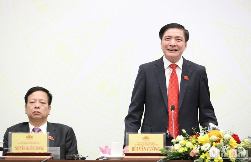 Ủy viên Ủy ban Thường vụ Quốc hội, Tổng Thư ký Quốc hội, Chủ nhiệm Văn phòng Quốc hội Bùi Văn Cường phát biểu tại họp báo. (Ảnh: DUY LINH).