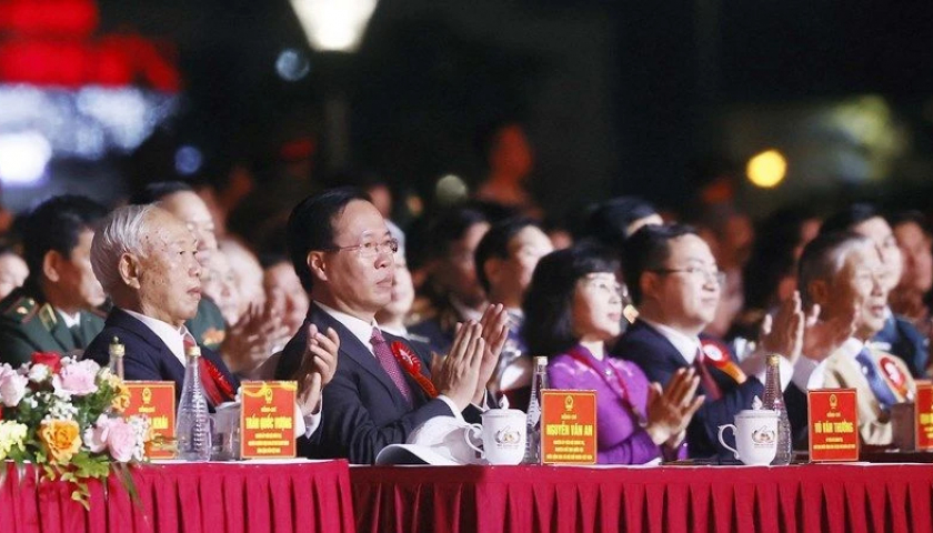 Chủ tịch nước Võ Văn Thưởng và các vị lãnh đạo, nguyên lãnh đạo Đảng, Nhà nước dự Lễ kỷ niệm 60 năm Ngày thành lập tỉnh Quảng Ninh. (Ảnh: Thống Nhất/TXVN).