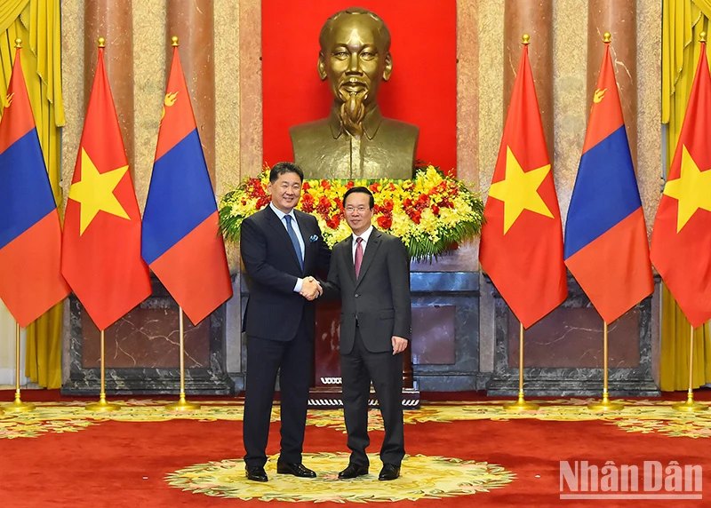 Chủ tịch nước Võ Văn Thưởng và Tổng thống Mông Cổ Ukhnaagiin Khurelsukh. (Ảnh: Thủy Nguyên).