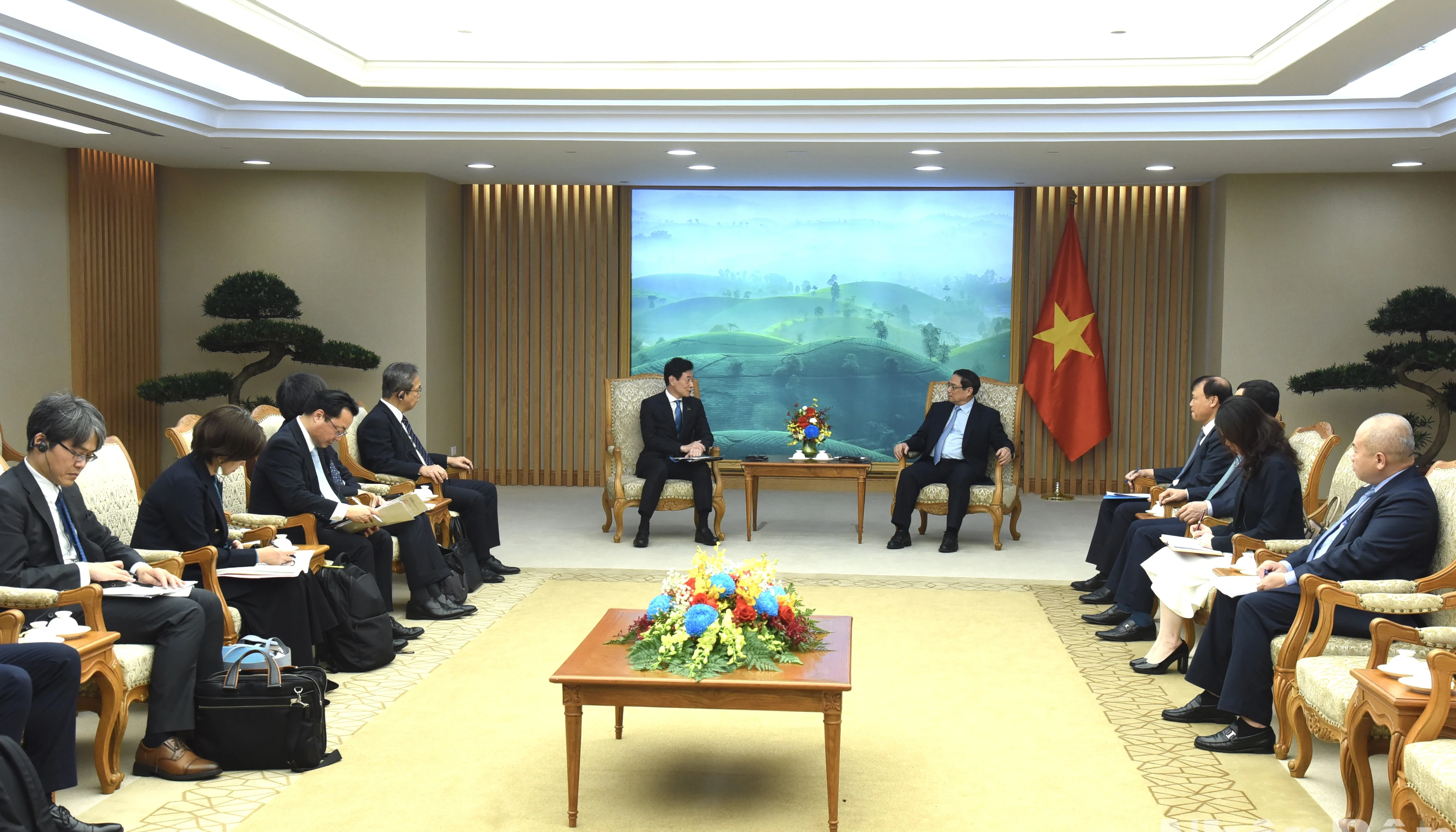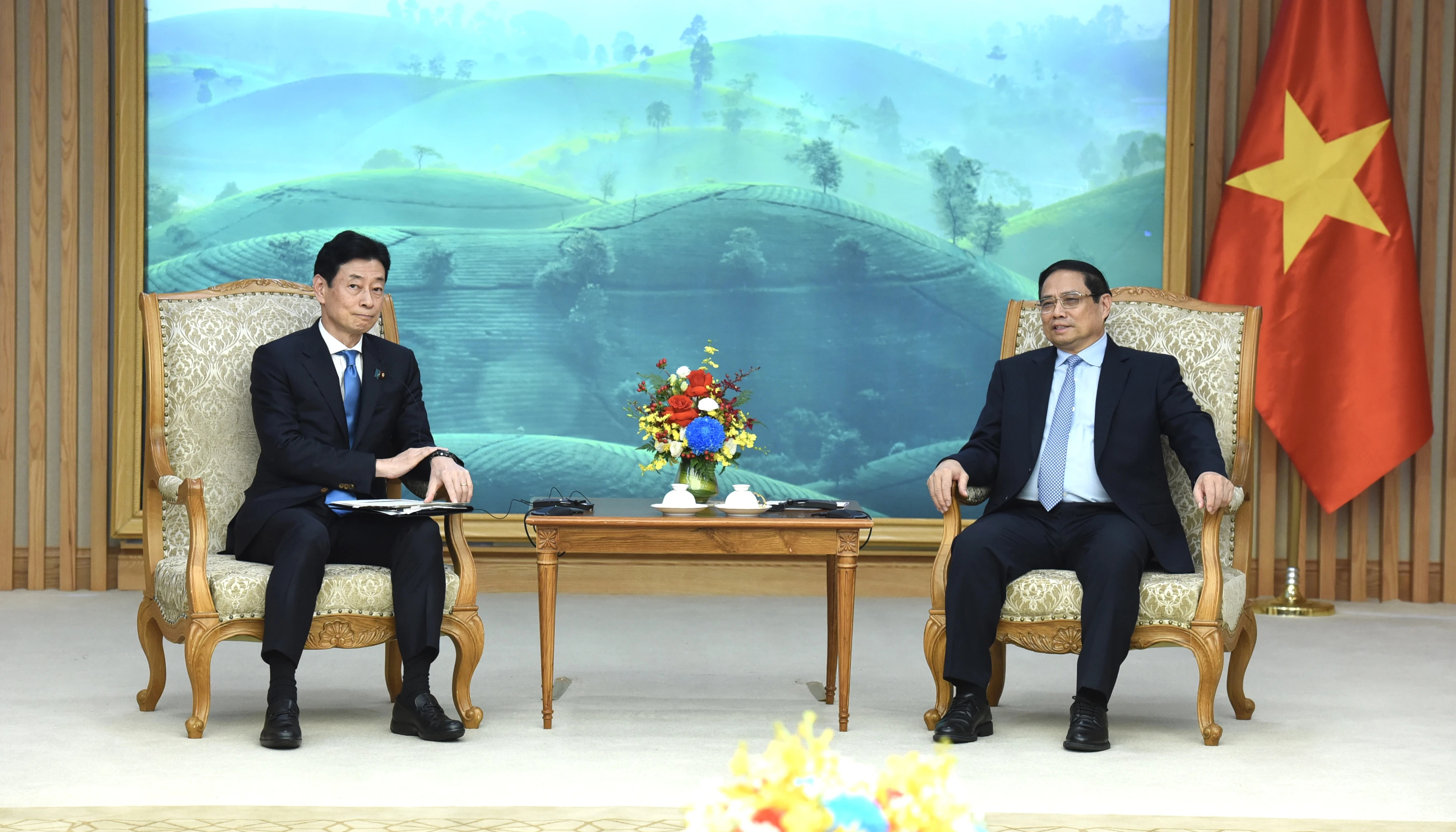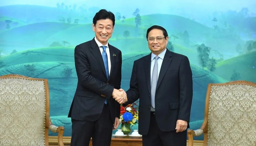 Thủ tướng Phạm Minh Chính tiếp Bộ trưởng Bộ Kinh tế, Thương mại và Công nghiệp Nhật Bản Nishimura Yasutoshi.
