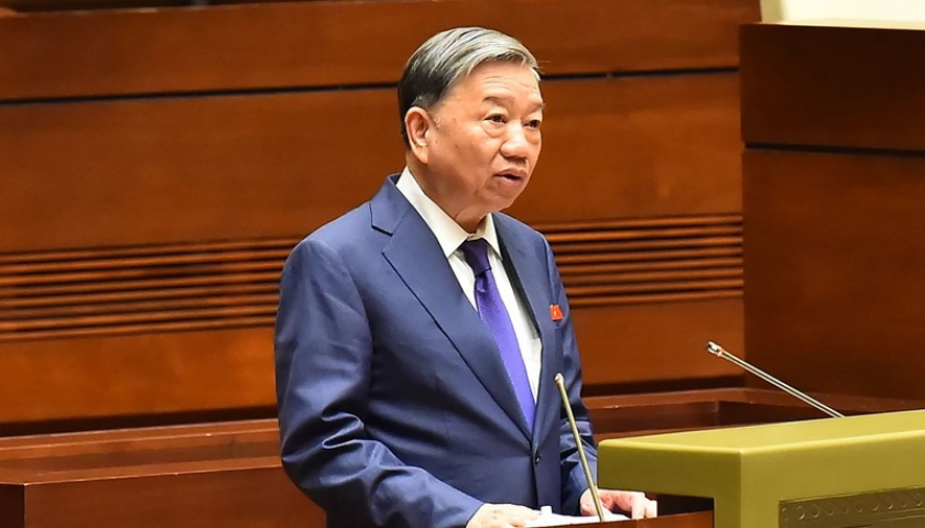 Bộ trưởng Công an Tô Lâm trình bày Tờ trình về dự án Luật Trật tự, an toàn giao thông đường bộ. (Ảnh: THỦY NGUYÊN).