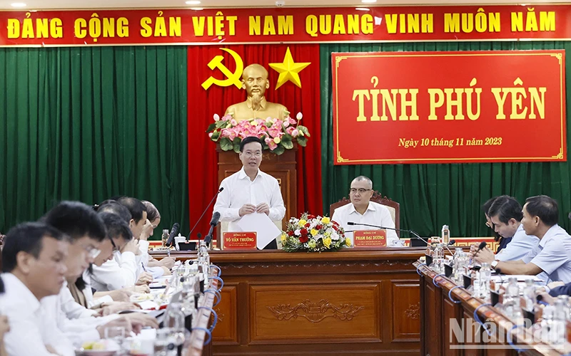 Chủ tịch nước Võ Văn Thưởng làm việc với lãnh đạo chủ chốt tỉnh Phú Yên về triển khai thực hiện nhiệm vụ nửa đầu nhiệm kỳ Nghị quyết Đại hội XIII của Đảng, Nghị quyết Đại hội Đảng bộ tỉnh lần thứ 17, nhiệm kỳ 2020-2025. (Ảnh: TTXVN).