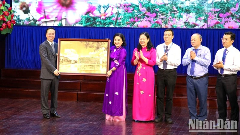 Ban giám hiệu Trường Đại học Khoa học xã hội và Nhân văn tặng Chủ tịch nước Võ Văn Thưởng bức tranh lưu niệm.