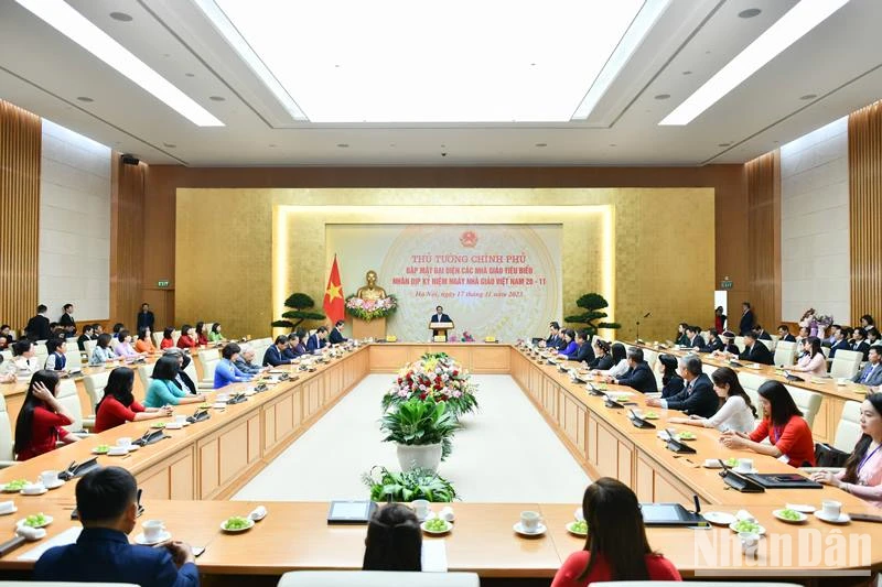 Phát biểu ý kiến tại buổi gặp mặt, Thủ tướng Phạm Minh Chính trân trọng chuyển lời thăm hỏi ân cần, lời chúc sức khỏe và lời chúc mừng tốt đẹp nhất của đồng chí Tổng Bí thư Nguyễn Phú Trọng tới tất cả các thầy giáo, cô giáo, các em học sinh và các bậc phụ huynh trên cả nước nhân dịp kỷ niệm Ngày Nhà giáo Việt Nam 20/11/2023.