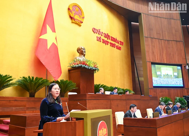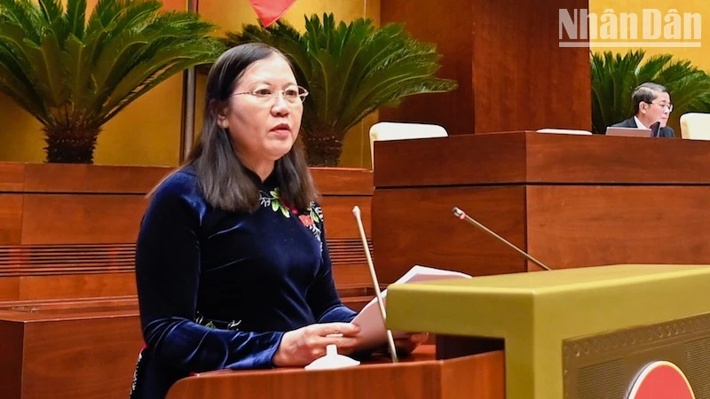 Chủ nhiệm Ủy ban Tư pháp Lê Thị Nga trình bày Báo cáo thẩm tra Báo cáo về công tác phòng, chống tham nhũng năm 2023. (Ảnh: Duy Linh).