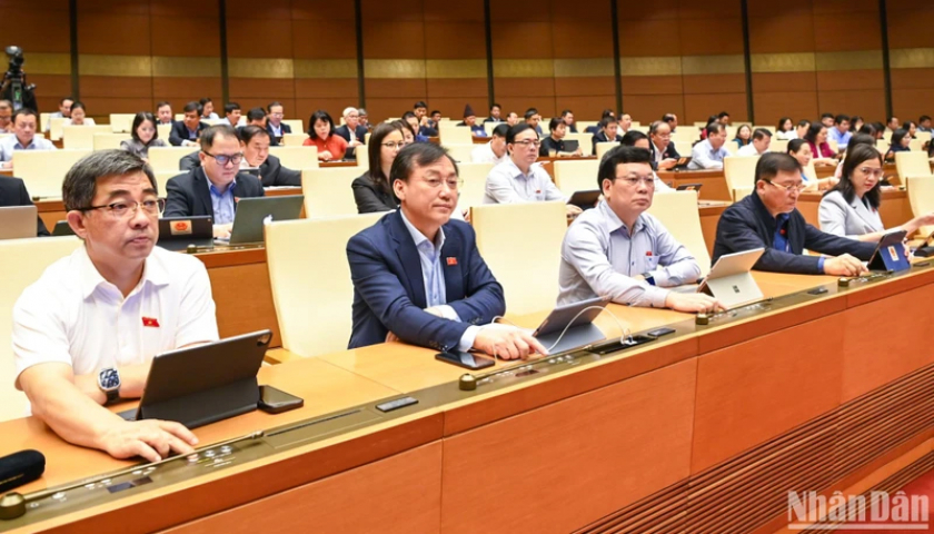Các đại biểu Quốc hội tiến hành biểu quyết thông qua dự thảo Luật Viễn thông (sửa đổi). (Ảnh: DUY LINH).