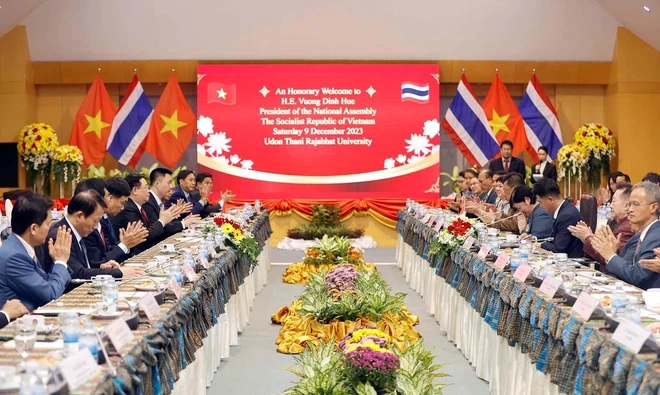 Thay mặt Ban Lãnh đạo, giảng viên, sinh viên Đại học Hoàng gia Rajabhat Udon Thani, Hiệu trưởng, Tiến sĩ Khanisara Thansunthornsakun bày tỏ vinh dự được đón Chủ tịch Quốc hội Vương Đình Huệ và Đoàn đại biểu cấp cao Quốc hội Việt Nam đến thăm; cho biết, trường đã ký kết nhiều chương trình hợp tác với các cơ sở giáo dục tại Việt Nam ở nhiều địa phương như tại Đà Nẵng, Quảng Bình, Quảng Trị, Thái Nguyên, Điện Biên...