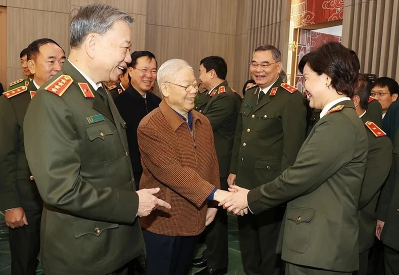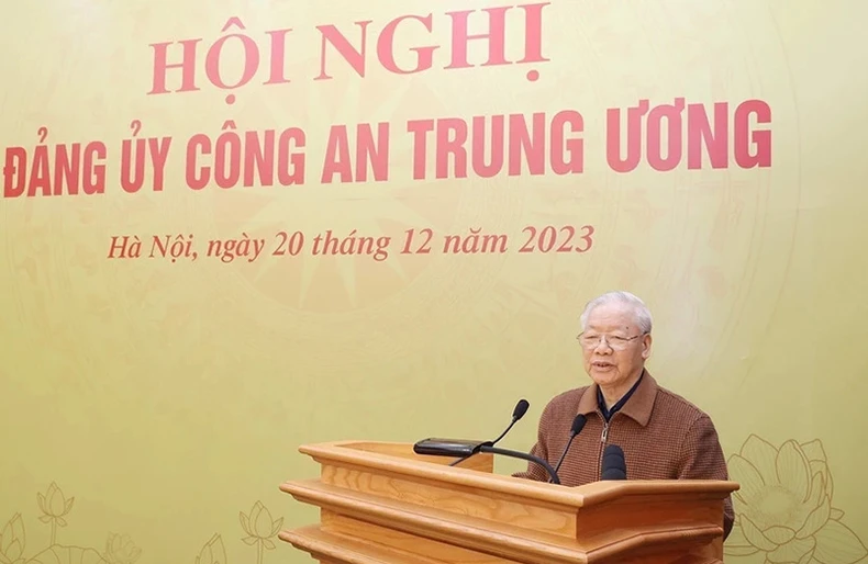 Thay mặt lãnh đạo Đảng, Nhà nước và với tình cảm cá nhân, Tổng Bí thư Nguyễn Phú Trọng chúc mừng và biểu dương những thành tích, chiến công của Đảng ủy Công an Trung ương, Bộ Công an và ngành Công an nước nhà.