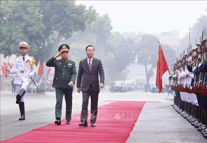 Chủ tịch nước Võ Văn Thưởng với lãnh đạo Quân ủy Trung ương, Bộ Quốc phòng và các đại biểu. (Ảnh: Thống Nhất/TTXVN).