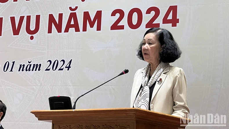 Đồng chí Trương Thị Mai, Ủy viên Bộ Chính trị, Thường trực Ban Bí thư, Trưởng Ban Tổ chức Trung ương dự và phát biểu chỉ đạo Hội nghị. Đồng chí Lê Hoài Trung, Bí thư Trung ương Đảng, Trưởng Ban Đối ngoại Trung ương chủ trì Hội nghị.