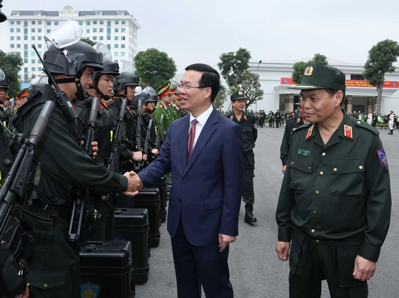 Chủ tịch nước Võ Văn Thưởng thăm hỏi, động viên các chiến sĩ Cảnh sát cơ động. Ảnh: Thống Nhất/TTXVN.