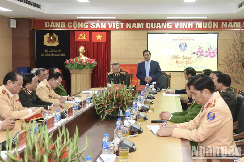 Thủ tướng Phạm Minh Chính và Bộ trưởng Công an Tô Lâm đến thăm, chúc Tết Cục Cảnh sát giao thông.