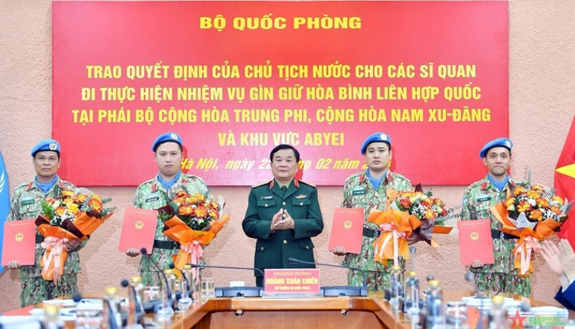 Ngày 22/2, tại Hà Nội, Bộ Quốc phòng tổ chức Lễ trao Quyết định của Chủ tịch nước cho 4 sĩ quan đi làm nhiệm vụ gìn giữ hòa bình Liên hợp quốc tại Phái bộ Cộng hòa Trung Phi, Cộng hòa Nam Sudan và Phái bộ An ninh lâm thời Liên hợp quốc ở khu vực Abyei (UNISFA).