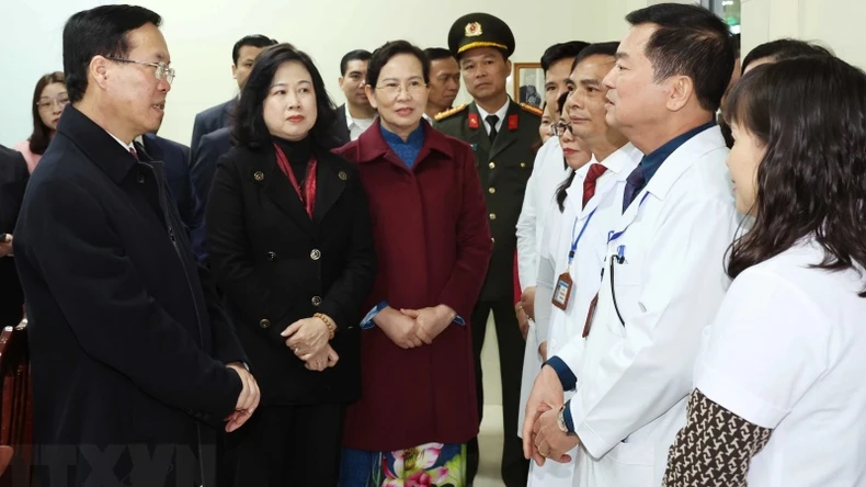 Chủ tịch nước Võ Văn Thưởng thăm bệnh nhân tại Trung tâm Y tế huyện Thanh Liêm. (Ảnh: Thống Nhất/TTXVN).