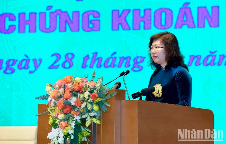 Chủ tịch Ủy ban Chứng khoán Nhà nước Vũ Thị Chân Phương trình bày báo cáo tóm tắt tình hình thị trường chứng khoán Việt Nam năm 2023 và triển vọng năm 2024.