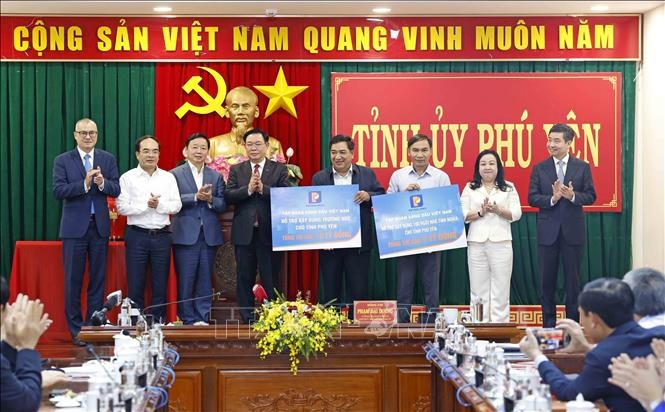Chủ tịch Quốc hội Vương Đình Huệ và Phó Thủ tướng Trần Hồng Hà chứng kiến Tập đoàn Xăng dầu Việt Nam trao hỗ trợ 10 tỷ đồng xây dựng trường học và 5 tỷ đồng xây dựng 100 căn nhà tình nghĩa cho tỉnh Phú Yên. Ảnh: Nhan Sáng-TTXVN.