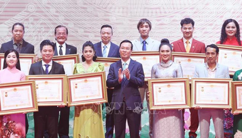 Chủ tịch nước Võ Văn Thưởng trao tặng danh hiệu Nghệ sĩ nhân dân cho các nghệ sĩ. Ảnh: TTXVN.
