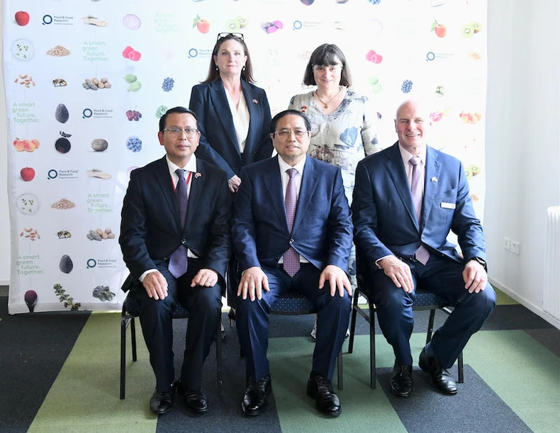 Thủ tướng Phạm Minh Chính chụp ảnh lưu niệm với lãnh đạo Trung tâm Nghiên cứu cây trồng và thực phẩm New Zealand.