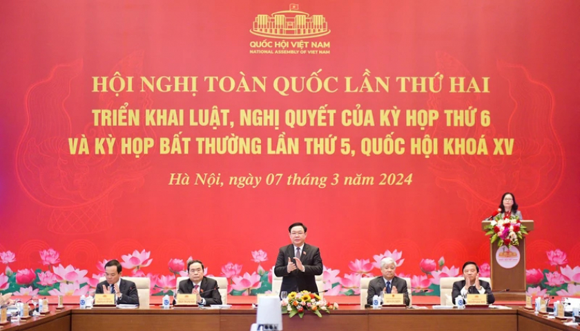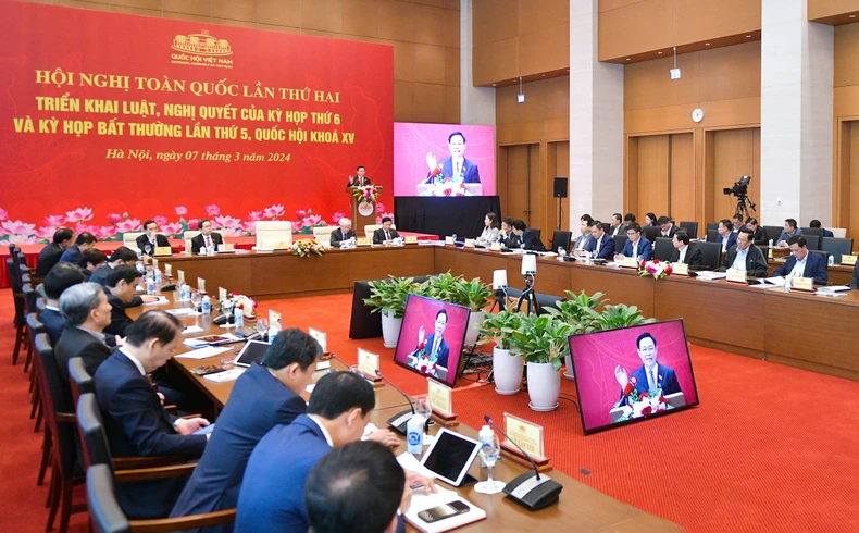 Thực hiện yêu cầu trong các nghị quyết của Đảng về “gắn kết chặt chẽ giữa xây dựng pháp luật với tổ chức thi hành pháp luật, bảo đảm pháp luật được thực hiện công bằng, nghiêm minh, nhất quán, kịp thời, hiệu lực, hiệu quả”, căn cứ nhiệm vụ, quyền hạn của Ủy ban Thường vụ Quốc hội theo quy định của Luật Tổ chức Quốc hội và nhiệm vụ được giao tại Nghị quyết số 110/2023/QH15 về Kỳ họp thứ 6, Quốc hội khóa XV, ngày 7/3/2024, Ủy ban Thường vụ Quốc hội đã phối hợp với Chính phủ, Ủy ban Trung ương Mặt trận Tổ quốc Việt Nam và các cơ quan, tổ chức hữu quan tổ chức Hội nghị toàn quốc lần thứ hai triển khai luật, nghị quyết của Kỳ họp thứ 6 và Kỳ họp bất thường lần thứ 5, Quốc hội khóa XV.