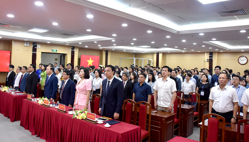 Các đại biểu thực hiện nghi thức chào cờ, hát Quốc ca.