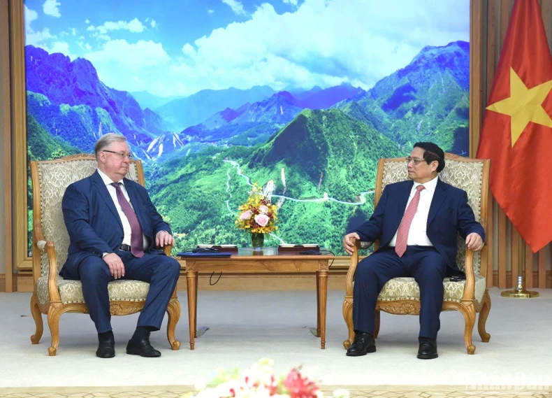 Thủ tướng Phạm Minh Chính tiếp Chủ tịch Hội Luật gia Liên bang Nga Sergey Stepashin, nguyên Thủ tướng Chính phủ Liên bang Nga. (Ảnh: TRẦN HẢI).
