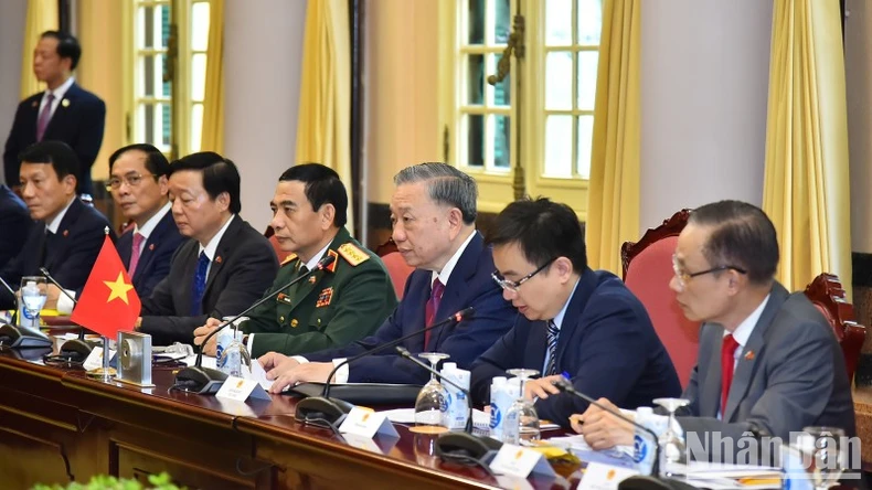 Quang cảnh buổi hội đàm giữa Chủ tịch nước Tô Lâm và Tổng thống Liên bang Nga Vladimir Putin tại Phủ Chủ tịch.