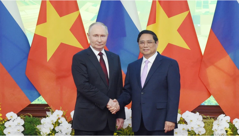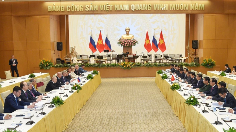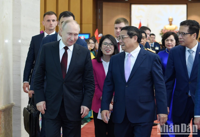 Thủ tướng Chính phủ Phạm Minh Chính vui mừng chào đón Tổng thống Vladimir Putin thăm cấp Nhà nước đến Việt Nam đúng vào dịp hai nước kỷ niệm 30 năm Hiệp ước về các nguyên tắc cơ bản của quan hệ hữu nghị Việt Nam-Nga; chúc mừng những thành tựu to lớn của nước Nga dưới sự lãnh đạo của Tổng thống Vladimir Putin; bày tỏ tin tưởng Tổng thống sẽ tiếp tục quan tâm, ủng hộ Việt Nam và việc phát triển quan hệ Đối tác chiến lược toàn diện hai nước.