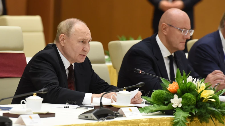 Thủ tướng Phạm Minh Chính trao đổi với Tổng thống Liên bang Nga Vladimir Putin. (Ảnh: Trần Hải).