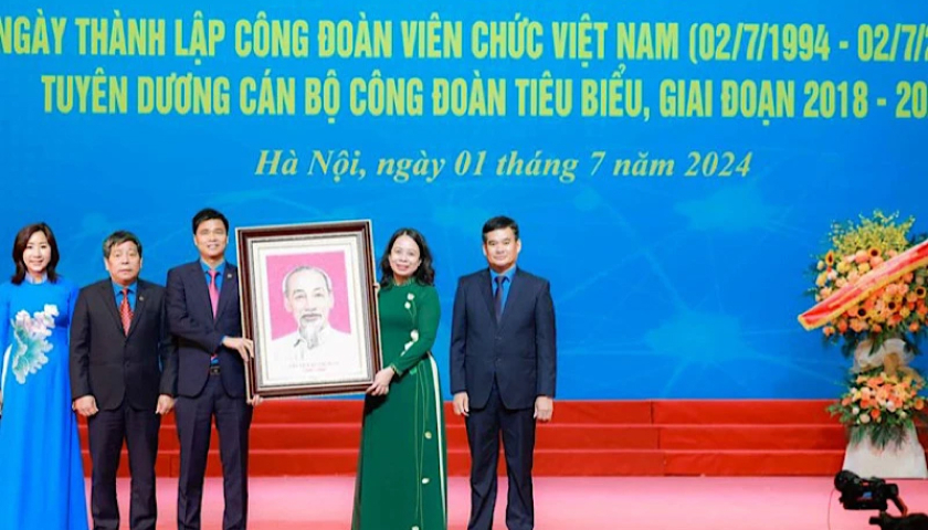 Phó Chủ tịch nước Võ Thị Ánh Xuân trao ảnh Chủ tịch Hồ Chí Minh tặng lãnh đạo Công đoàn Viên chức Việt Nam.