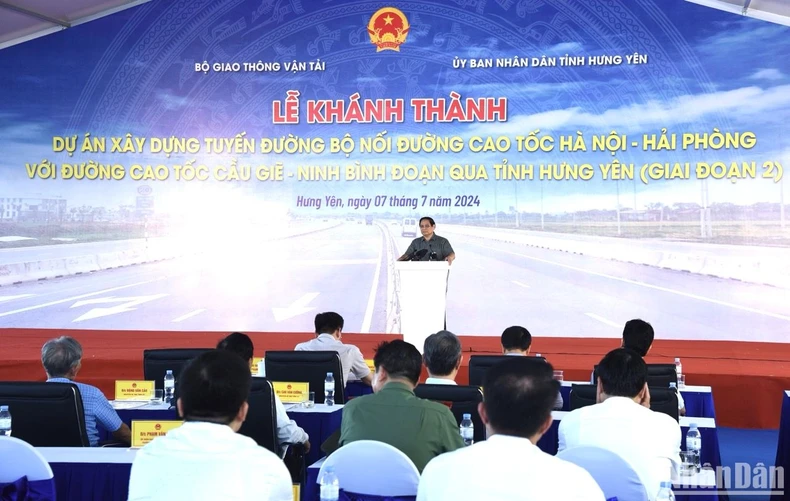 Thủ tướng Phạm Minh Chính phát biểu ý kiến tại lễ khánh thành tuyến đường nối 2 tuyến cao tốc Hà Nội-Hải Phòng với Cầu Giẽ-Ninh Bình.