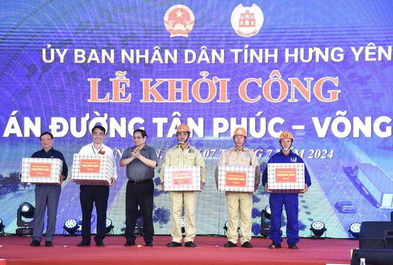 Nhân buổi lễ, Thủ tướng Phạm Minh Chính tặng quà động viên các đơn vị tham gia thi công tuyến đường.