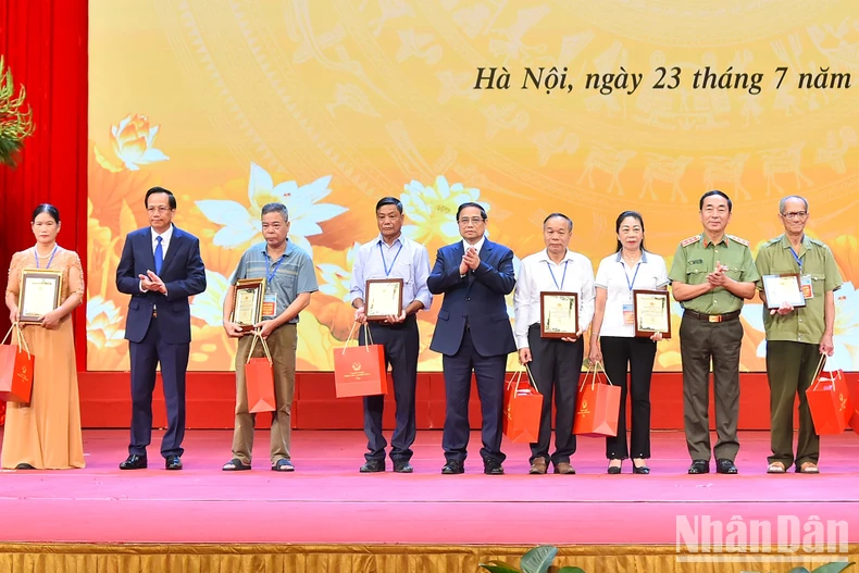 Thủ tướng Phạm Minh Chính và các đồng chí lãnh đạo đã trao kết quả giám định mẫu hài cốt cho đại diện 10 gia đình liệt sĩ; tặng quà cho các đại biểu người có công với cách mạng tiêu biểu toàn quốc; tặng quà và hoa tri ân các Mẹ Việt Nam anh hùng, cán bộ lão thành cách mạng.