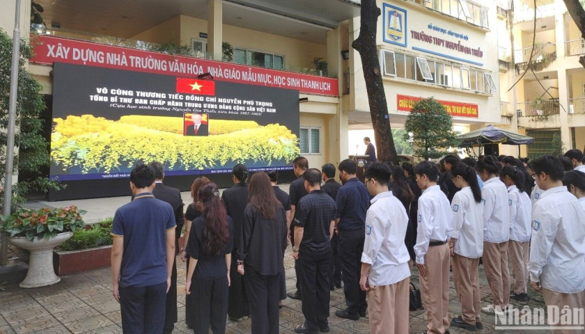 Lễ tưởng niệm Tổng Bí thư Nguyễn Phú Trọng tại Trường THPT Nguyễn Gia Thiều. (Ảnh: TRUNG HƯNG).