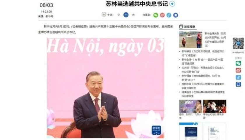 Cũng trong chiều 3/8, các cơ quan thông tấn, báo chí chính thống của Trung Quốc, trong đó có Tân Hoa xã, Đài Truyền hình Trung ương Trung Quốc (CCTV), Nhân dân Nhật báo, đồng loạt đưa tin về việc Ban Chấp hành Trung ương Đảng Cộng sản Việt Nam khóa XIII sáng 3/8 đã họp tại Hà Nội, bầu Chủ tịch nước Tô Lâm làm Tổng Bí thư Ban Chấp hành Trung ương Đảng Cộng sản Việt Nam, với số phiếu tuyệt đối 100%. Tổng Bí thư, Chủ tịch Trung Quốc Tập Cận Bình đã gửi điện chúc mừng Tổng Bí thư, Chủ tịch nước Tô Lâm.
