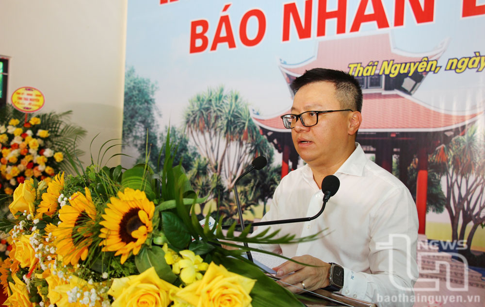 Đồng chí Lê Quốc Minh, Ủy viên Trung ương Đảng, Tổng Biên tập Báo Nhân Dân, Phó Trưởng Ban Tuyên giáo Trung ương, Chủ tịch Hội Nhà báo Việt Nam phát biểu tại Lễ khánh thành công trình trùng tu, tôn tạo Nhà bia di tích lịch sử quốc gia Báo Nhân Dân ra số đầu tiên (11/3/1951) tại xóm Khuôn Nhà, xã Quy Kỳ, huyện Định Hóa (ngày 10/7/2024).